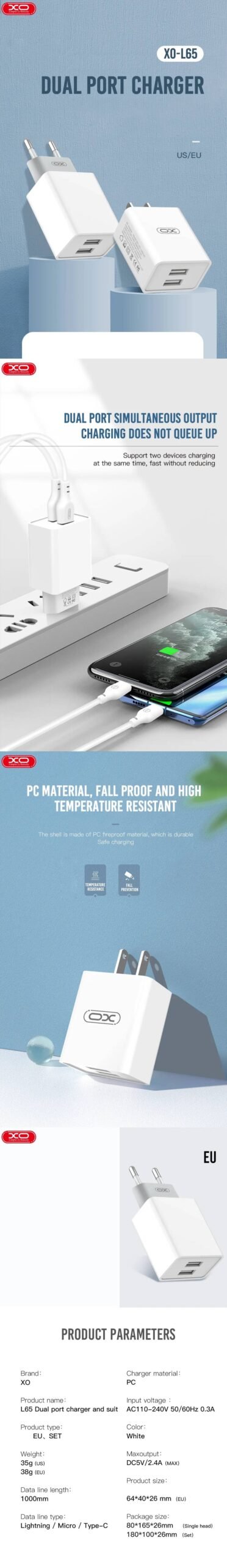 XO L65 is an advanced charger with max. 2.4 A current equipped with two USB sockets. It provides enough energy to charge even the largest mobile devices available. The classic look fits all types of interiors and the quality of workmanship indicates that it is a solid and durable device.